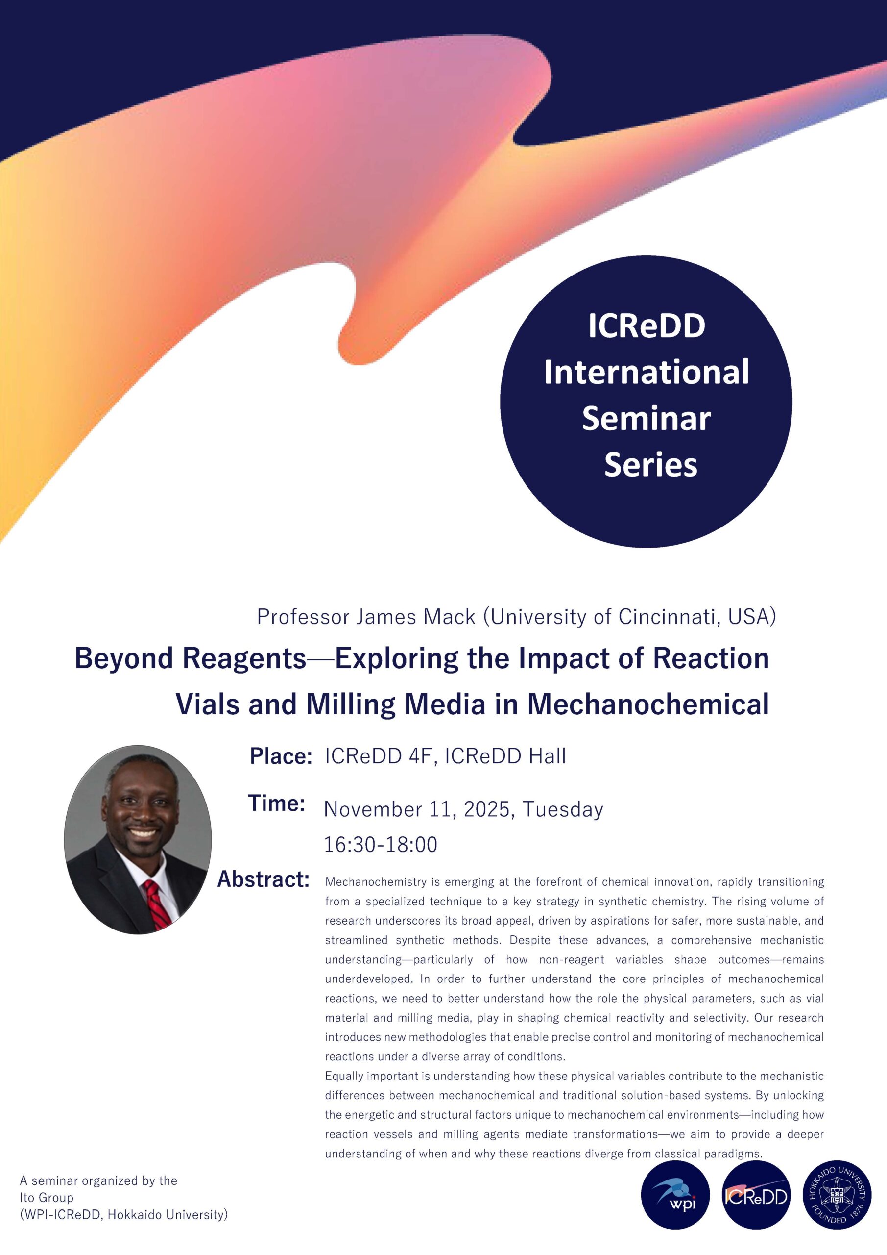 Event ICReDD International Seminar by Prof. James Mack (University of Cincinnati, USA) For researchers In English Event DateNov. 11 (Tue), 2025 On Tuesday, November 11th 2025, ICReDD will host a seminar by Prof. James Mack (University of Cincinnati, USA). See the poster below for details.
