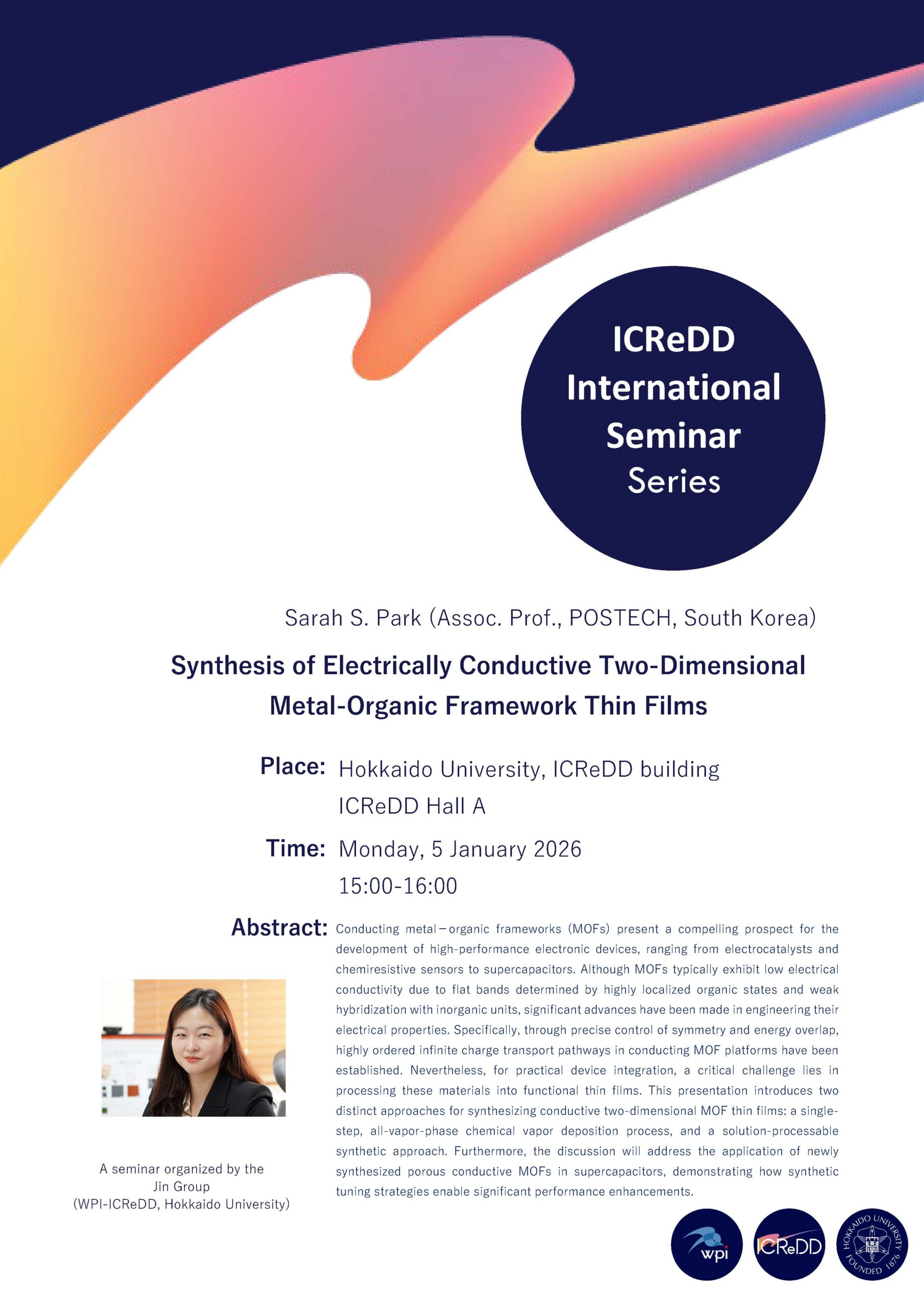 On Monday, January 5th 2026, at 15:00-, ICReDD will host a seminar by Assoc. Prof. Sarah S. Park (POSTECH, South Korea).