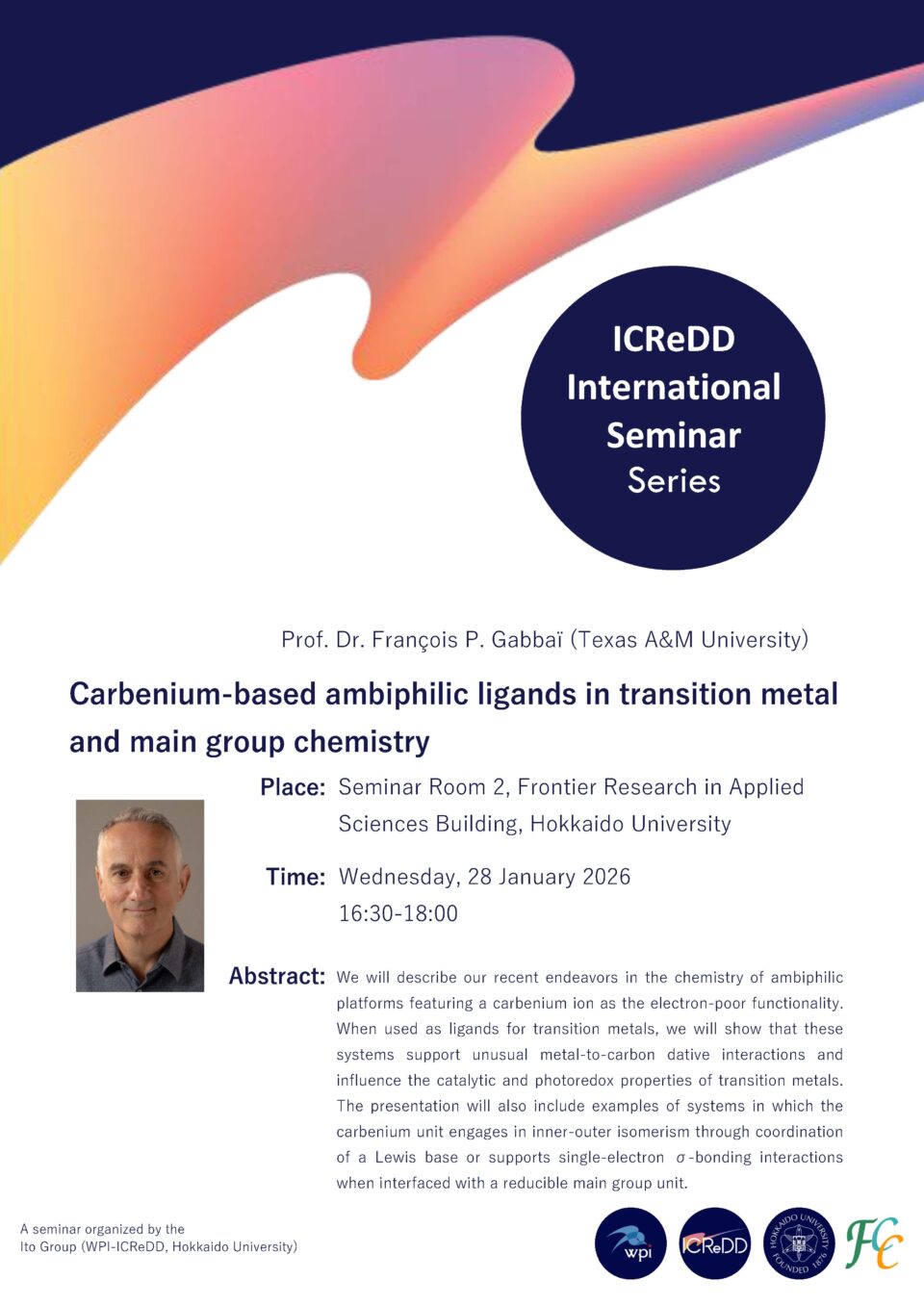 Event FCC-ICReDD International Seminar by Prof. Dr. François P. Gabbaï (Texas A&M University, USA) For researchers In English Event DateJan. 28 (Wed), 2026 On Wednesday, January 28th 2026, ICReDD and FCC will co-host a seminar by Prof. Dr. François P. Gabbaï (Texas A&M University). See the poster below for details.