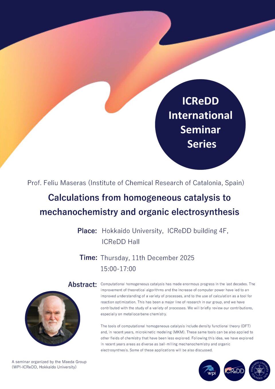 イベント スペイン, ICIQの Prof. Feliu Maseras 講師によるICReDD国際セミナーを開催します 研究者向け 英語 開催日2025年12月11日(木) 12月11日(木)、Institute of Chemical Research of Catalonia (ICIQ, スペイン) のProf. Feliu Maserasを講師に迎え、ICReDD国際セミナーを開催します。 詳細は下記ポスターをご覧ください。