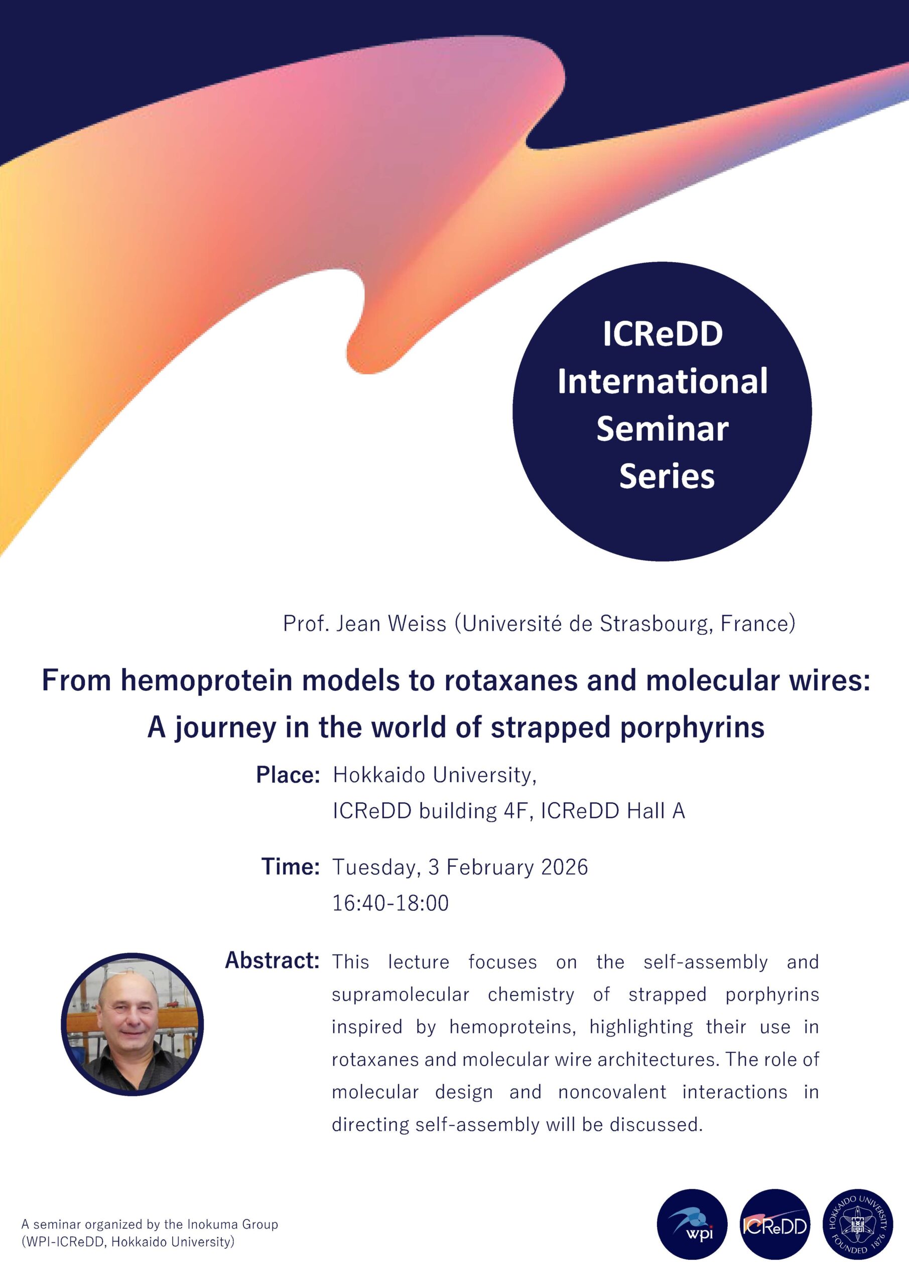 イベント ストラスブール大学 Jean Weiss 教授によるICReDD国際セミナーを開催します 研究者向け 英語 開催日2026年02月03日(火) 2026年2月3日(火)、フランス・ストラスブール大学の Jean Weiss 教授を講師に迎え、ICReDD国際セミナーを開催します。 詳細は下記ポスターをご覧ください。 (アブストラクトは変更になる可能性があります)