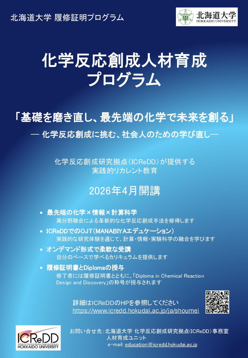 北海道大学 化学反応創成研究拠点(ICReDD)では、社会人を対象とした履修証明プログラム「化学反応創成人材育成プログラム」を2026年4月より開講します。計算科学・情報科学・実験科学の連携によるICReDD独自のアプローチを通じて、化学反応創成の基礎から最先端までを体系的に学び直すことができる実践型リカレント教育プログラムです。