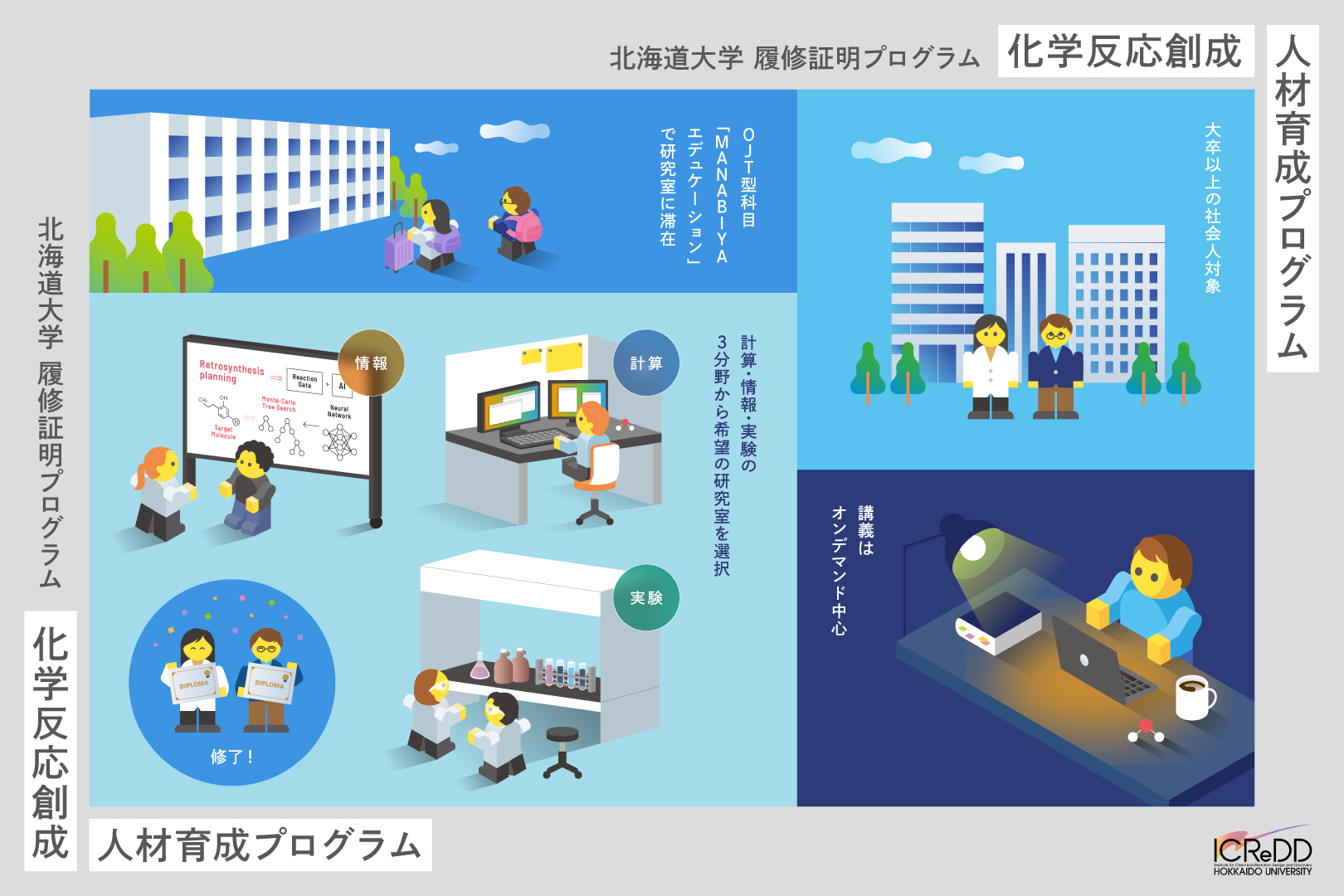 北海道大学 化学反応創成研究拠点(ICReDD)では、社会人を対象とした履修証明プログラム「化学反応創成人材育成プログラム」を開講します。計算科学・情報科学・実験科学の連携によるICReDD独自のアプローチを通じて、化学反応創成の基礎から最先端までを体系的に学び直すことができる実践型リカレント教育プログラムです。