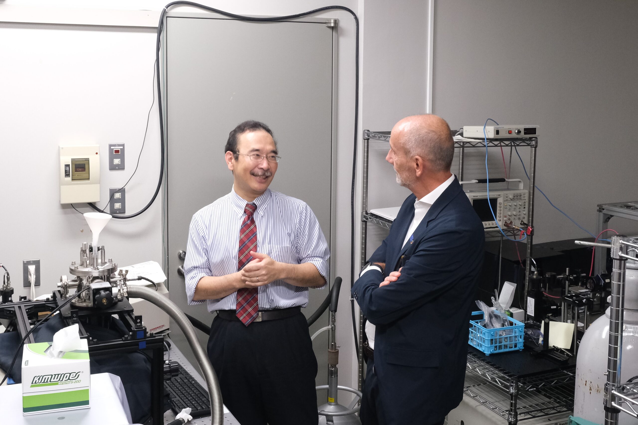 After the lecture for students and faculty members held on the same day in the Akira Suzuki Hall of the Frontier Research in Applied Sciences Building, Ambassador Paquet and his delegates moved to the Materials Engineering and Chemistry Building of the Faculty of Engineering led by ICReDD PI Prof. Yasuchika Hasegawa.