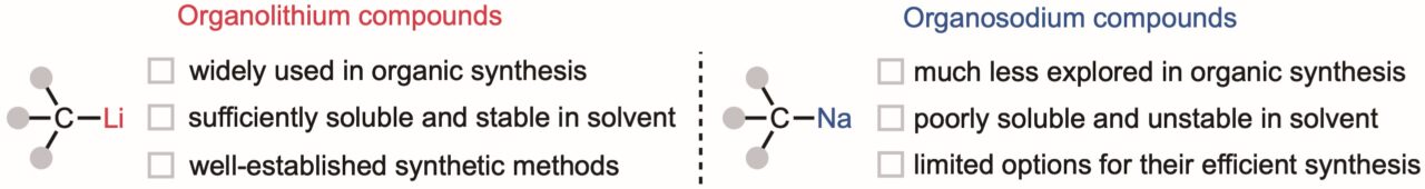 Highly reactive organometallic reagents, like organolithiums (molecules with a carbon–lithium bond) are essential reagents in organic synthesis because of their applications from polymer synthesis to pharmaceuticals, and more. Lithium resources, however, are difficult to access because concentrated deposits are geographically restricted and modern extraction methods are burdened with environmental costs. Replacing lithium with sodium would be a significant contribution towards environmentally friendly organic synthesis because it is >1000 times more abundant and its extraction from seawater is sustainable and inexpensive.